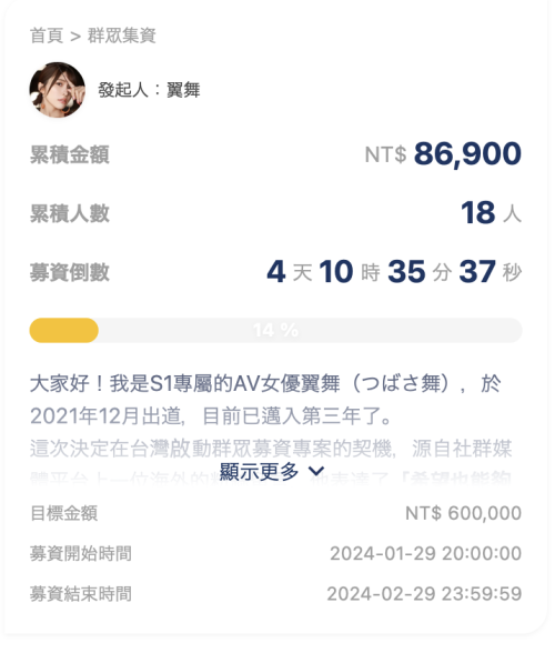 但他们的问题没有另一家那么严重,就看怎么解决,想想エイトマン(8MAN)在2020年的TRE台北国际成人展都已经决定出葵つかさ(葵司)了,要不是那该死的疫情不然葵つかさ(葵司)就不会等了三年又快三年;好消息是エイトマン(8MAN)已经不想再等了,所以在最近他们派出了社内数一数二的好手「つばさ舞(翼舞)」,用募资的方式要在台湾发写真集〜