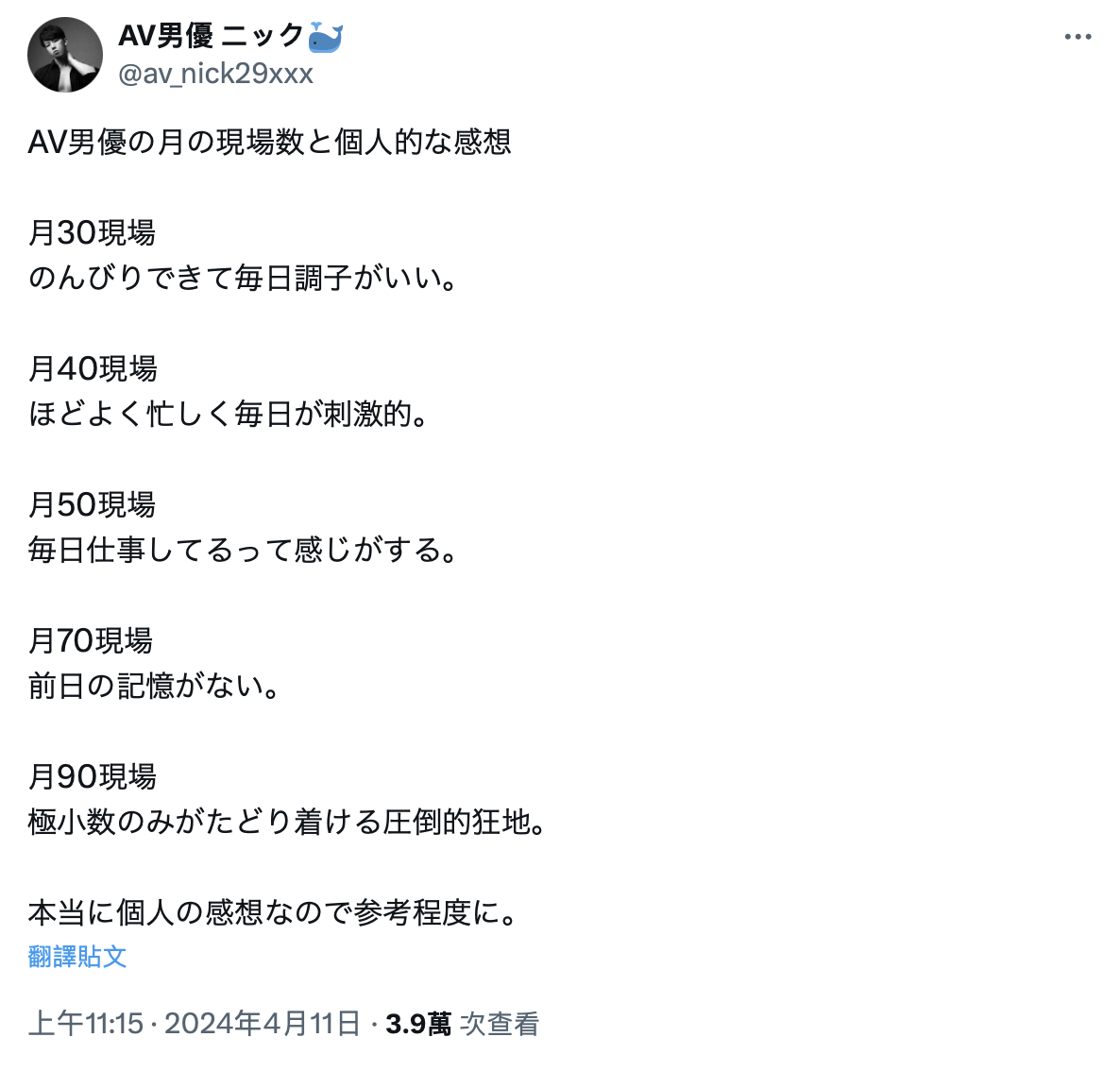 然后这个计算的单位叫做「现场」,只要身体负荷得了可以硬也可以射然后做好时间管理大师那一天3到4个现场也是OK的。而ニック(Nick)的发文则是以一个月为准,以工作的数量来讲自己的感受: