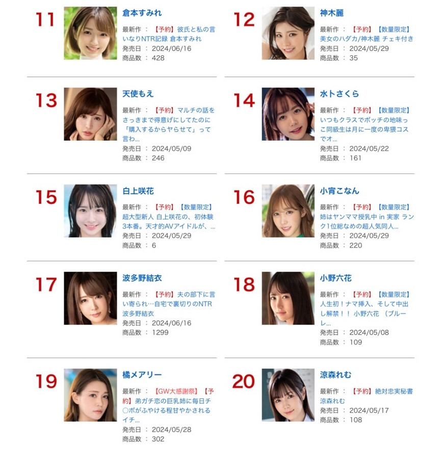 很快地,一年又过了三分之一,大家应该都感受到新人蜂涌而出的力道了,接着,我们马上来看上个月、2024年4月AV界的销售排行榜是谁称霸?