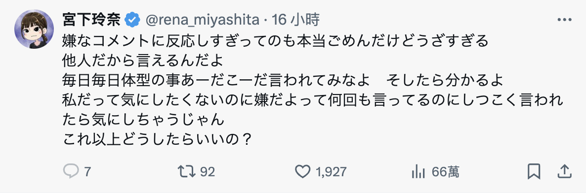 所以意思就是宫下玲奈也知道别和那些人吵架,但是没办法,因为她就不喜欢被讲身材的事ー至于人们大多批评她什么呢?就是她这一年来瘦了不少,有些人觉得她太瘦了于是会叫她多吃一点或是直接说她以前圆润一点的样子比较可爱,然后她觉得是那些是自己的事不需要人家指指点点,接着看当时的情绪有些时候她会好好解释、有些时候她会反唇相机有些时候则是暴怒回嘴,最后就吸引了一些人专门以刺激她为乐: