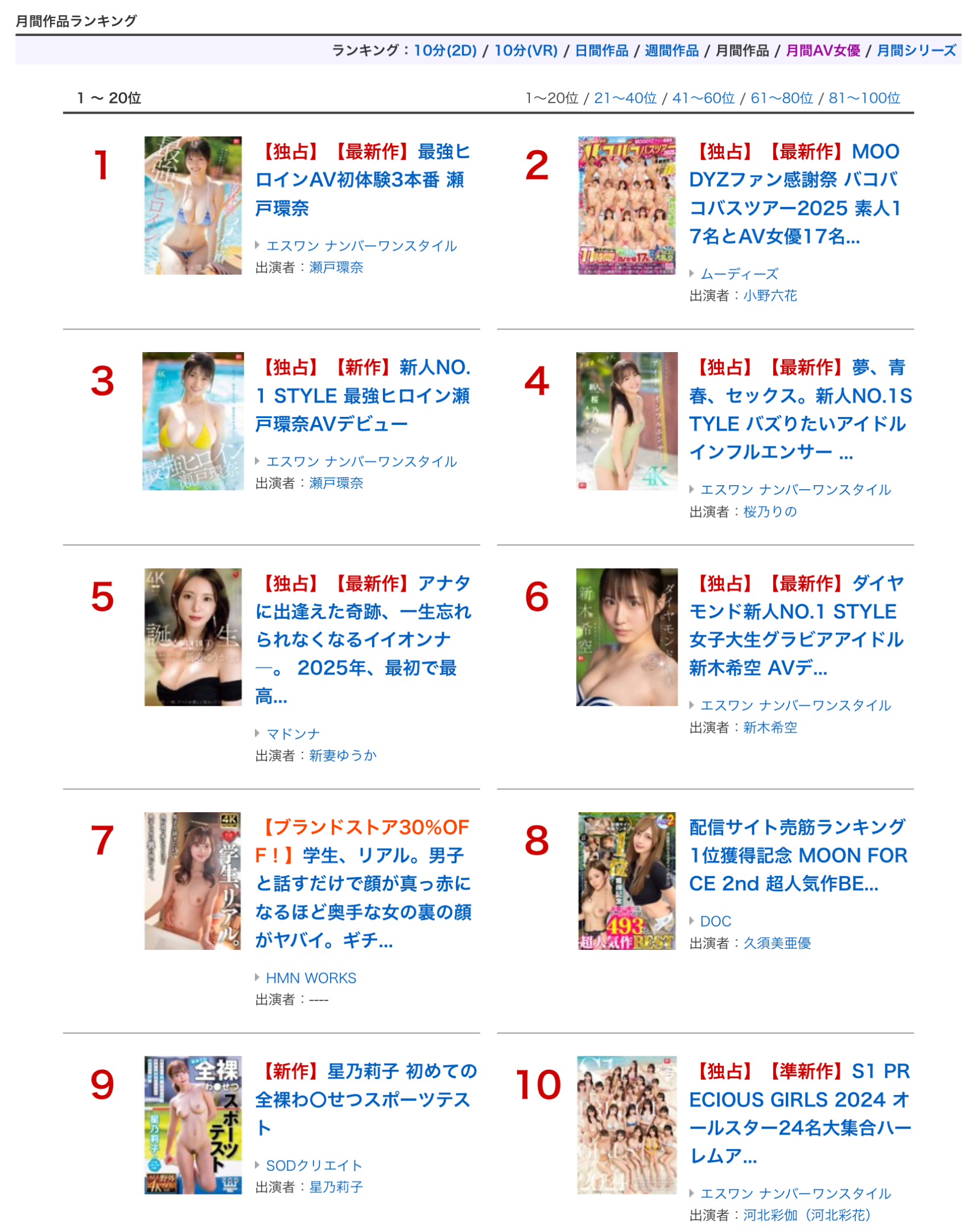 这次的冠亚军和之前有点不太一样,让瀬戸环奈拿下冠军的作品是她附赠拍立得的写真作品「ALL NUDE」」,她2泊3日的约会片「最强ヒロインの素颜とriaルセkkusが见たい!筋书きなしで性」欲のままに何度もずっと求め合うエロくて生々しい2泊3日SEXデート」只拿下第二个而且DVD版还跌到了第11名,虽然她还是巅峰巅峰非常强,继续在我们实体片的月间AV女优排行榜以及串流平台拿下作品销售冠军,不过可以观察一下这会不会是瀬戸环奈职业的转折: