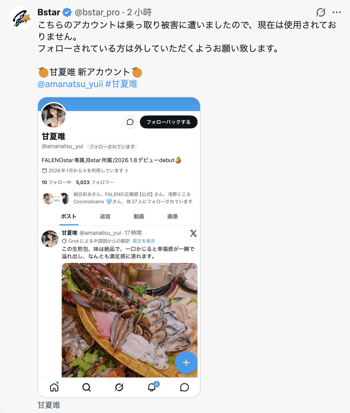 就在这个帐号发文后,甘夏唯所属的经纪公司Bstar发文,告诉大家甘夏唯这个帐号已经被盗了,请大家追踪她的新帐号(https://x.com/amanatsu_yuii),所以旧帐号发什么不用太在意了,今天是生煎包,明天可能是蚵仔煎了⋯