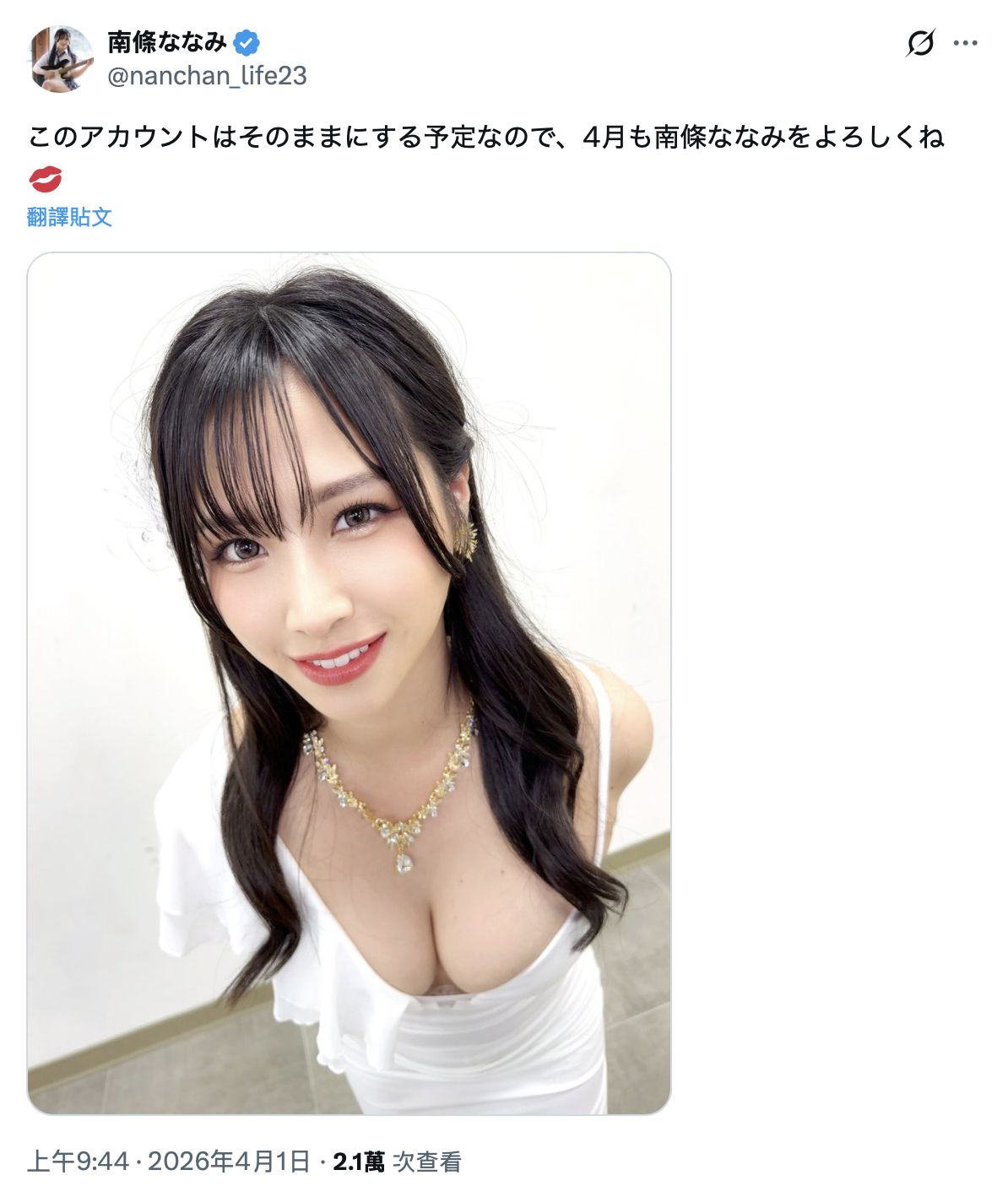 答案就在她的X页面(https://x.com/nanchan_life23)上,你可以发现她把名字改成了“南条ななみ(南条なな美)”,然后在她的个人资料中写道“平成脸的G罩杯~为天下问题男人开店(健康)5月~即将推出”,意思就是——