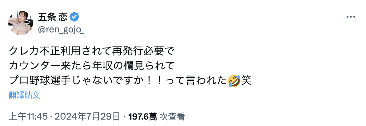办信用卡填年收入!五条恋让柜台小姐吓一跳:「妳是职棒球员吗?」