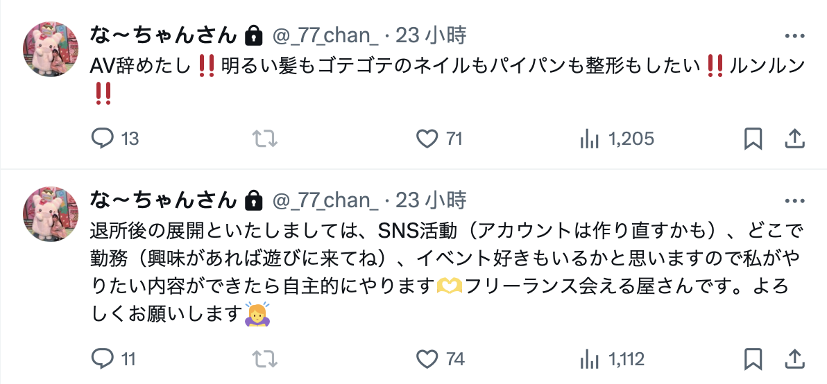 为什么要加啾咪呢?因为漆なな(漆奈奈)对离开事务所不拍AV应该是蛮开心的ー不过别怀疑,我不是暗示她讨厌这一行或是和事务所及经纪公司翻脸,而是在她的小号(https://x.com/_77_chan_,已锁帐)是这么写的ー
