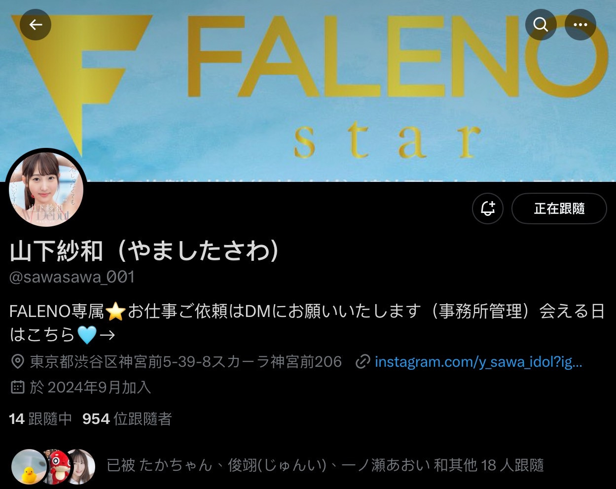 其实最近失去帐号的女优不只RARA一个,片商FALENO STAR的新人「山下纱和」更衰,出道作刚公布没多久帐号就和RARA一样失去了帐号,但她因为生涯才刚起步所以很干脆地注了新的帐号(https://x.com/sawasawa_001),只是到目前为止追踪还不到1000人: