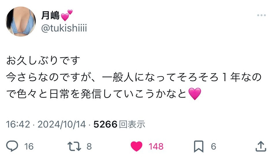 继前些日子突然在社群(https://x.com/tukishiiii)上传自己的照片后,山手梨爱又有了动作!