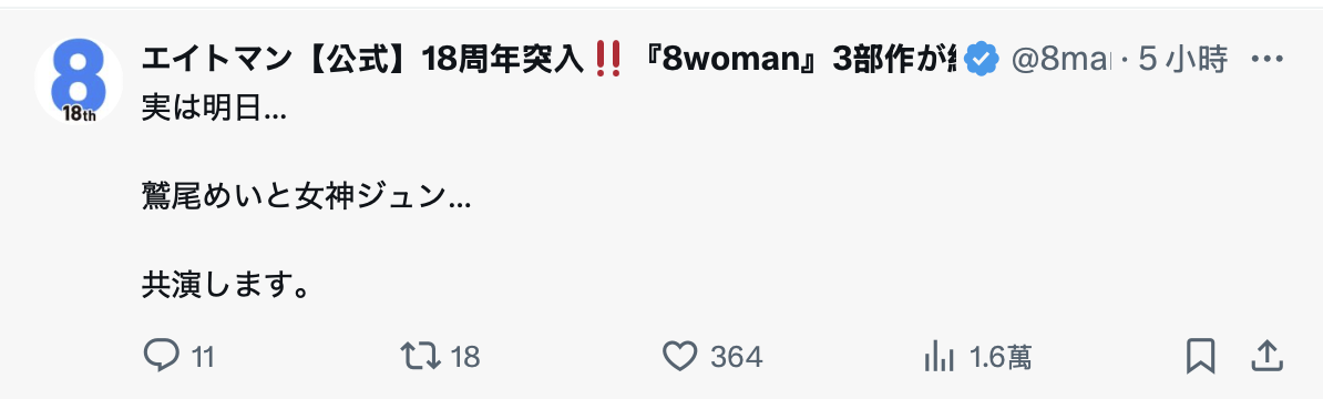 最爱爆料的事务所エイトマン(8MAN)是在官方X(https://x.com/8manpro)揭露了这个震撼的消息ー今天(11/28),鹫尾めい(鹫尾芽衣)要和女神ジュン(女神纯)共演〜
