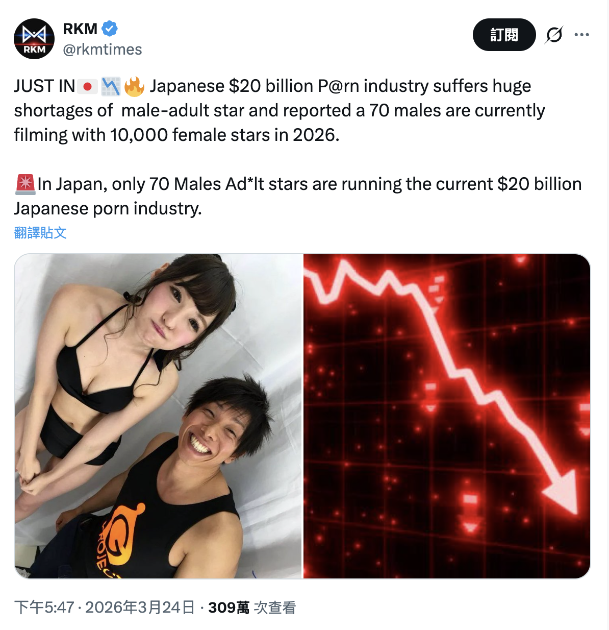 然后就有媒体报导,在日本这个产值高达200亿美元的影视工业,是由70位男优共享10000个AV女优,这可能蛮符合某些粉丝对日本AV界的想像,不过有个人说并不是这么回事ー