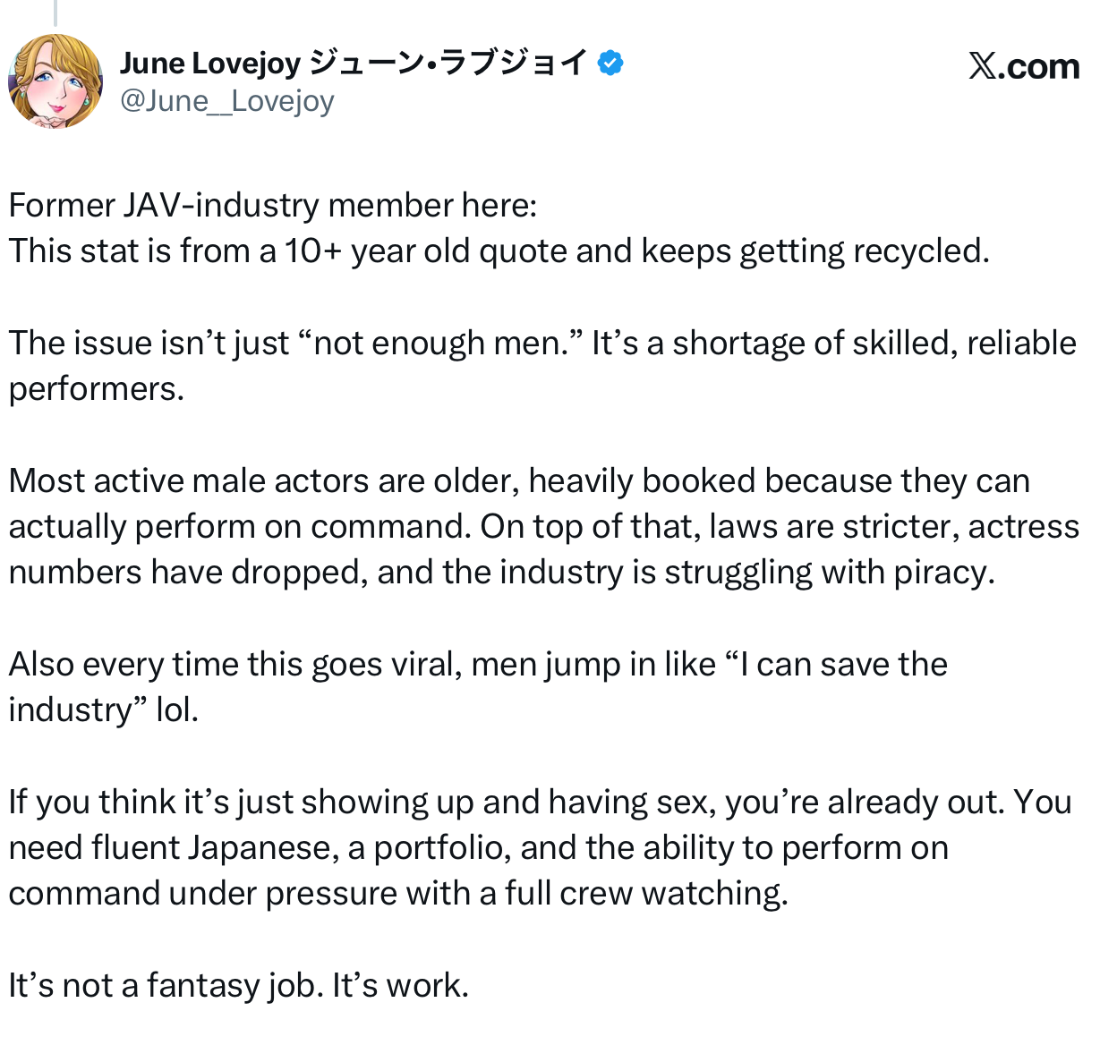 那就是已经宣布自日本AV界引退的外国女优June Lovejoy,他说日本的色情片产业只有70个男优在撑的说法是来自十多年前的一个访谈,现实状况并没有这么耸动ー确实,比起女优,男优的人数是比较少,但问题并不是人手不足,而是「有实力」而且「可靠」的男优不够用!